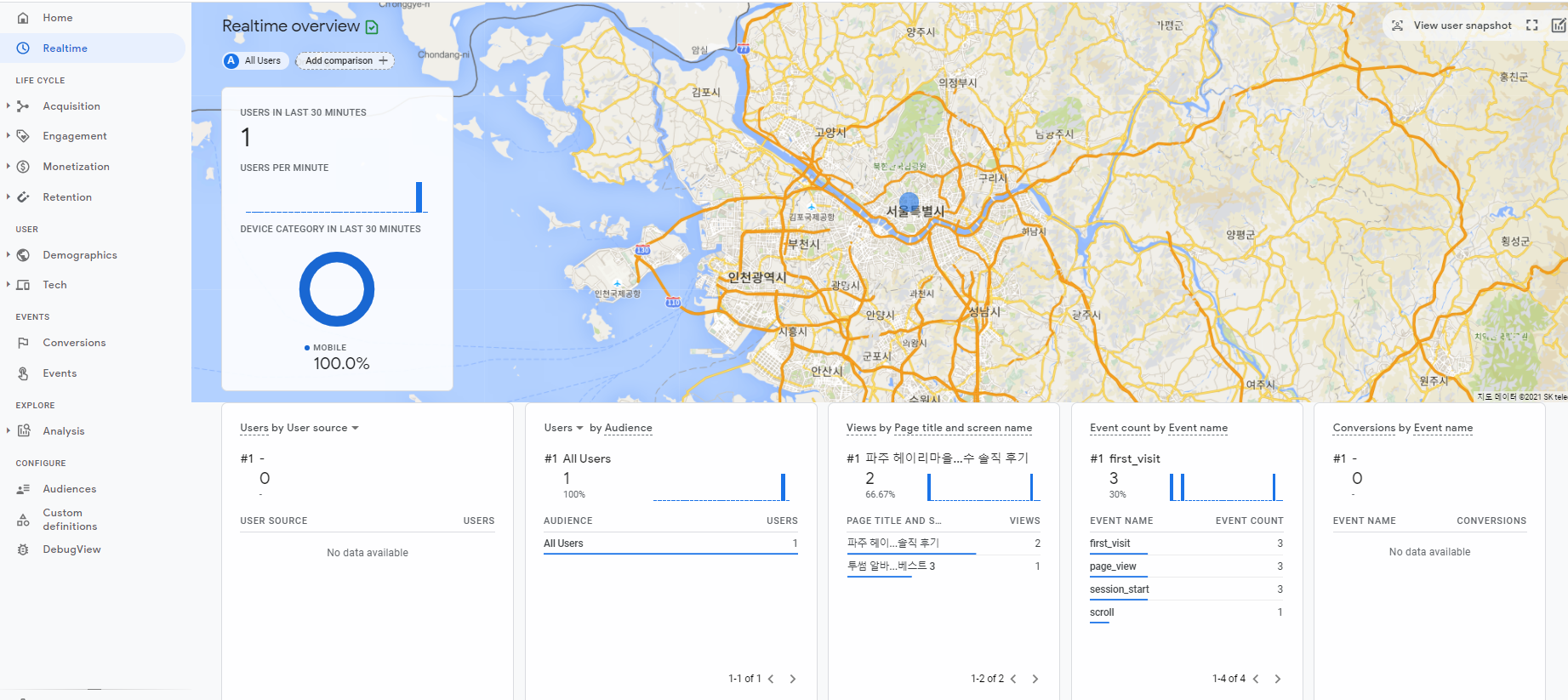 이 외에도 방문자가 어디에서 어떻게 들어왔는지, 페이지에 얼만큼 머물렀는지, 어떤 걸 클릭했는지 등등 살펴볼 수 있습니다.